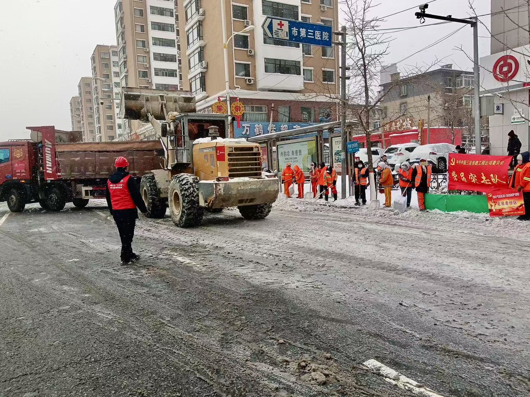中國(guó)三冶此次掃雪除冰涵蓋立山區(qū)勝利路、雙山路、建國(guó)路三條重要交通主干道及沿途多條社區(qū)道路。由中國(guó)三冶市政公司臨時(shí)成立黨員突擊隊(duì),派出4臺(tái)運(yùn)雪車及3臺(tái)鏟車,在大雪寒風(fēng)中邊下邊清,確保了春節(jié)前主要道路通暢,以實(shí)際行動(dòng)踐行了三冶人的初心使命與責(zé)任擔(dān)當(dāng),讓黨旗在除雪除冰一線高高飄揚(yáng)。